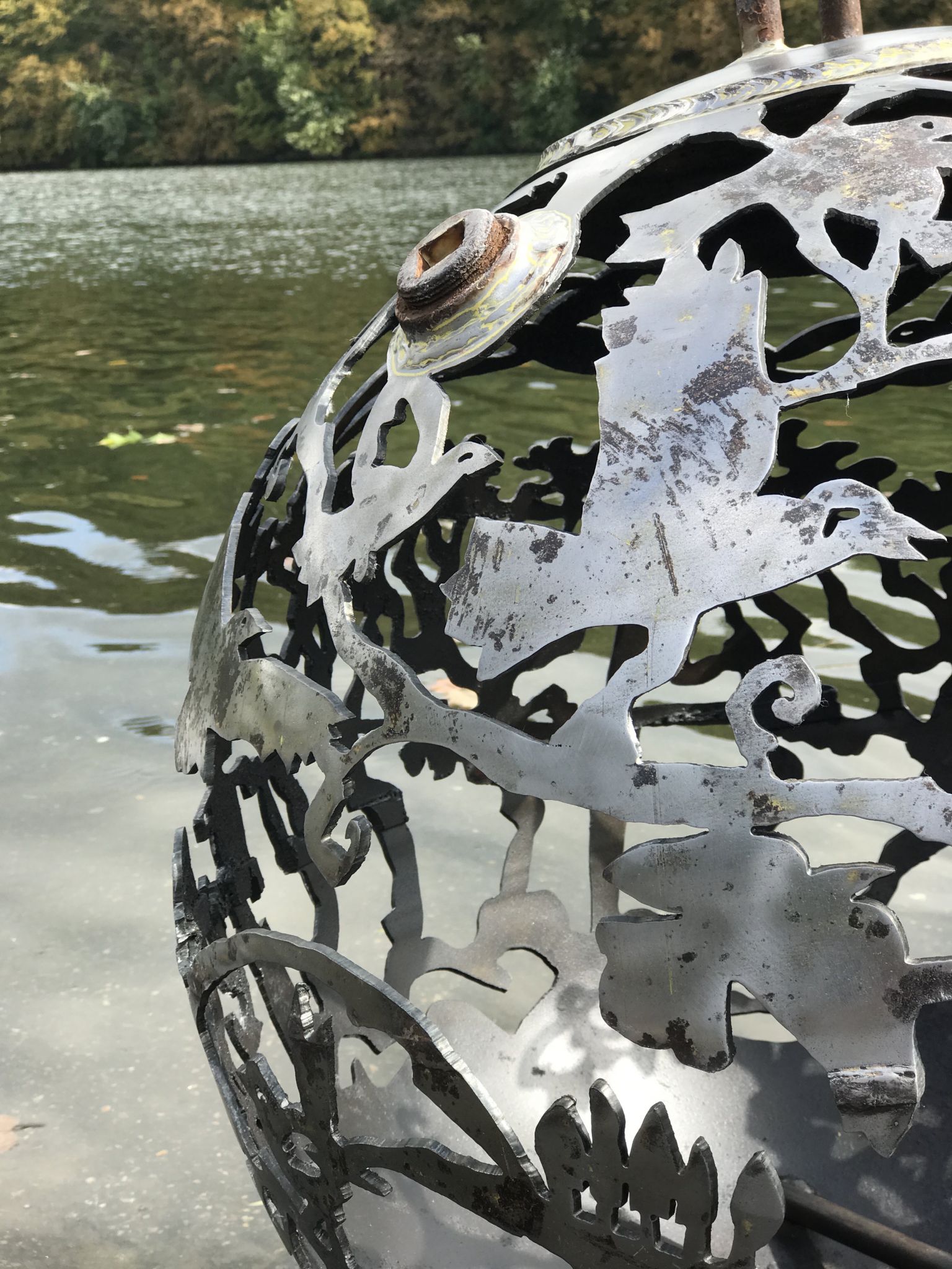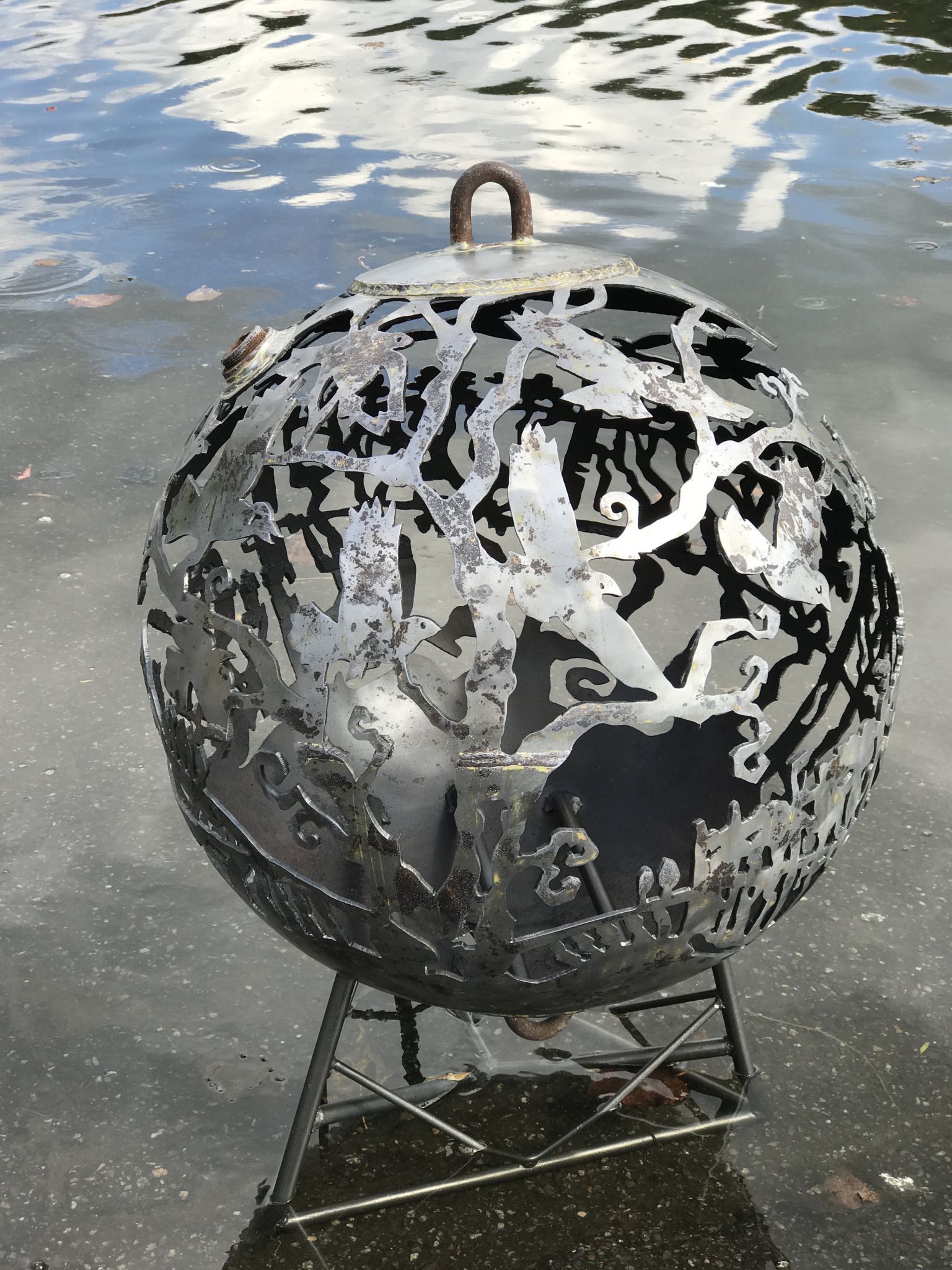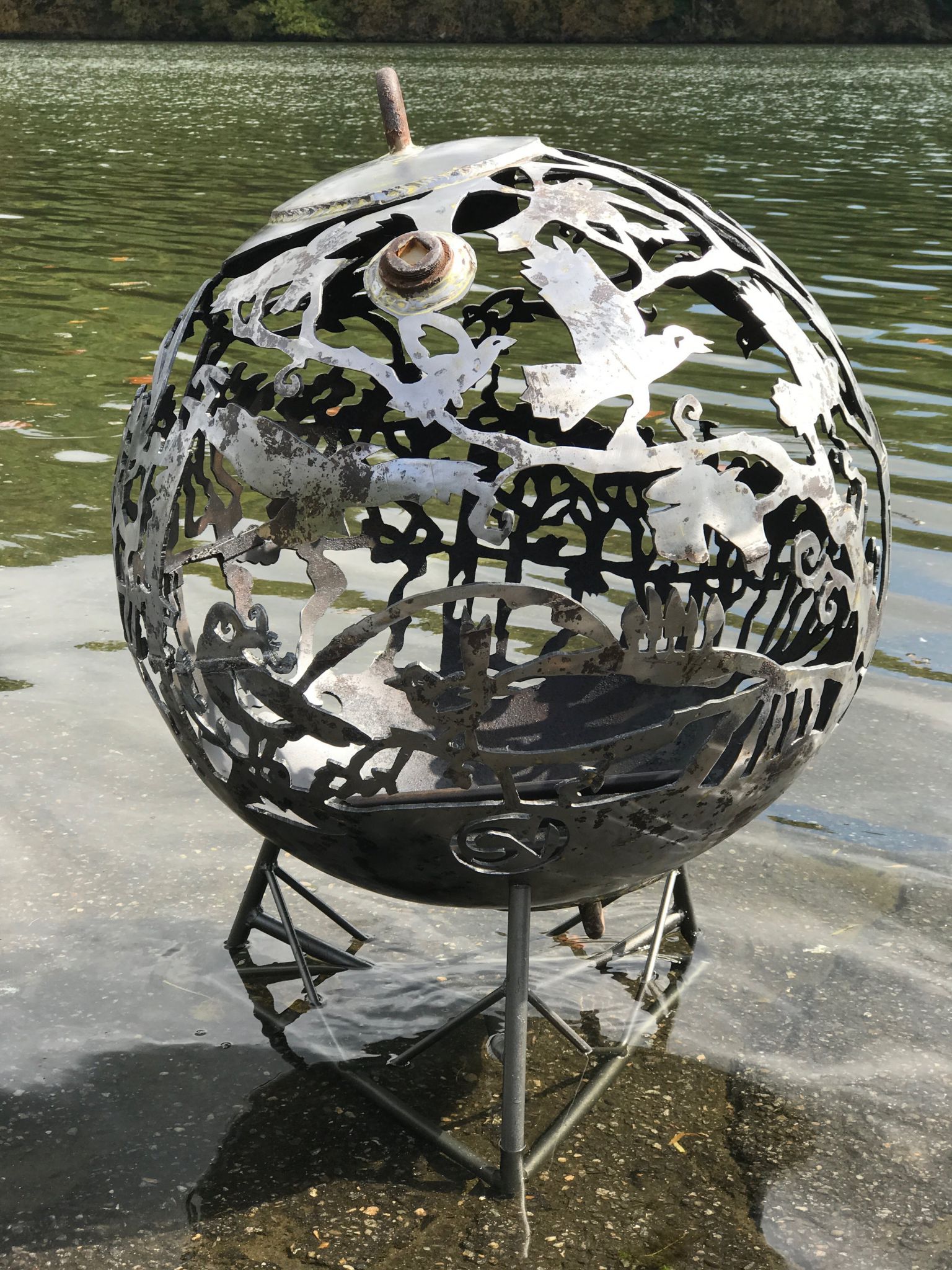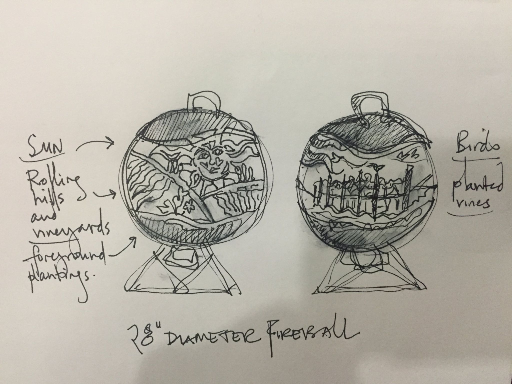 The 'Blackbirds in the Vineyard' Fireballs pictured here are 40" and 28" in diameter. The 40" Fireball has a natural steel finish. Both are designed for propane.